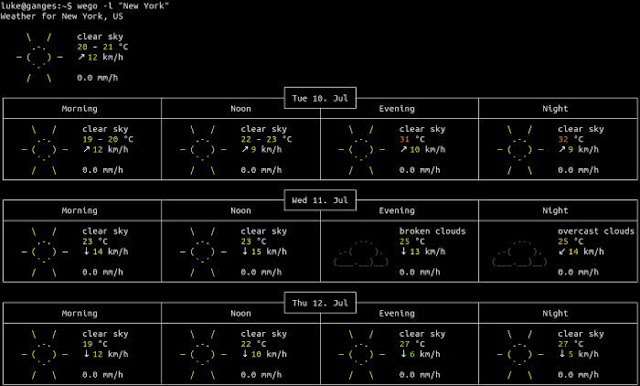 wego - очень удобная утилита для доступа к информации о погоде из терминала. Если вам нужен быстрый прогноз погоды и вы предпочитаете избегать веб-сервисов, попробуйте ее.