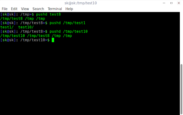 Как видно из вышеприведенного вывода, мы перешли в предыдущий рабочий каталог без необходимости вводить полный путь (например, /tmp/test8).