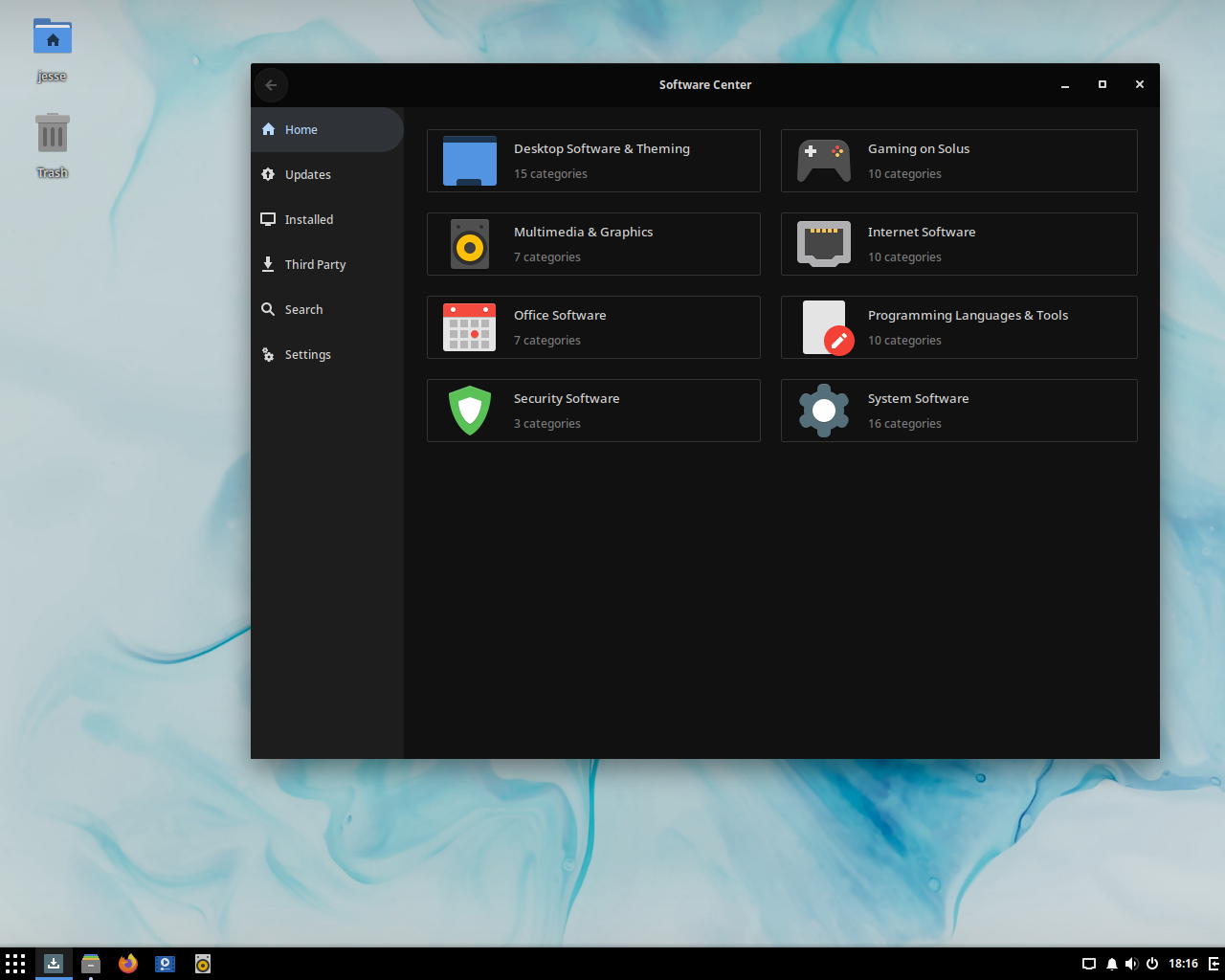 Центр программного обеспечения имеет шесть вкладок в левой части окна. Это Home, где отображаются категории программного обеспечения, которые мы можем просматривать; Updates, страница, которая просто показывает список доступных новых пакетов, которые мы можем установить; Installed, список установленных пакетов, которые мы можем удалить; Third-Party, несвободное программное обеспечение из неофициальных репозиториев, таких как Android Studio, Slack и Skype; Search, которая помогает нам находить программное обеспечение по названию; и Settings, где мы можем настроить частоту проверок обновлений и другие параметры, например, хотим ли мы загружать снимки экрана при просмотре информации о приложениях.